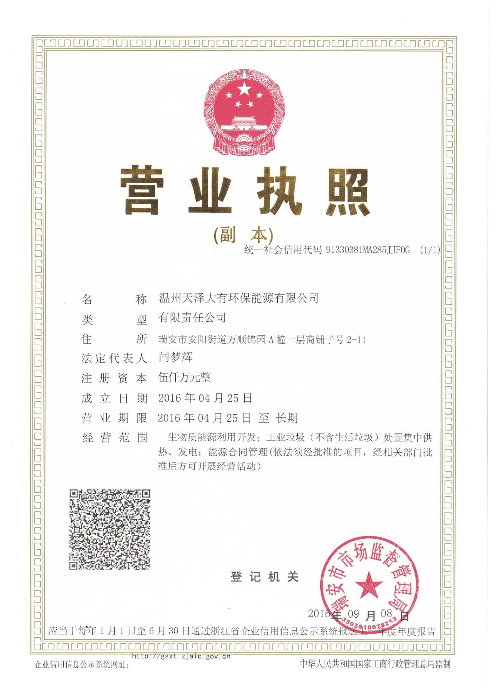 浙江天泽大有环保能源有限公司由九游(9Game)官方网站-体育竞技领航者、瑞安涵之能源公司等10位股东共同设立,注册资本金1亿元,其中九游(9Game)官方网站-体育竞技领航者持股28%。经营范围包括生物质能源利用开发,工业垃圾及污泥(不含生活垃圾)、建筑垃圾、装修垃圾、秸秆处置集中供热、发电,能源合同管理等业务。